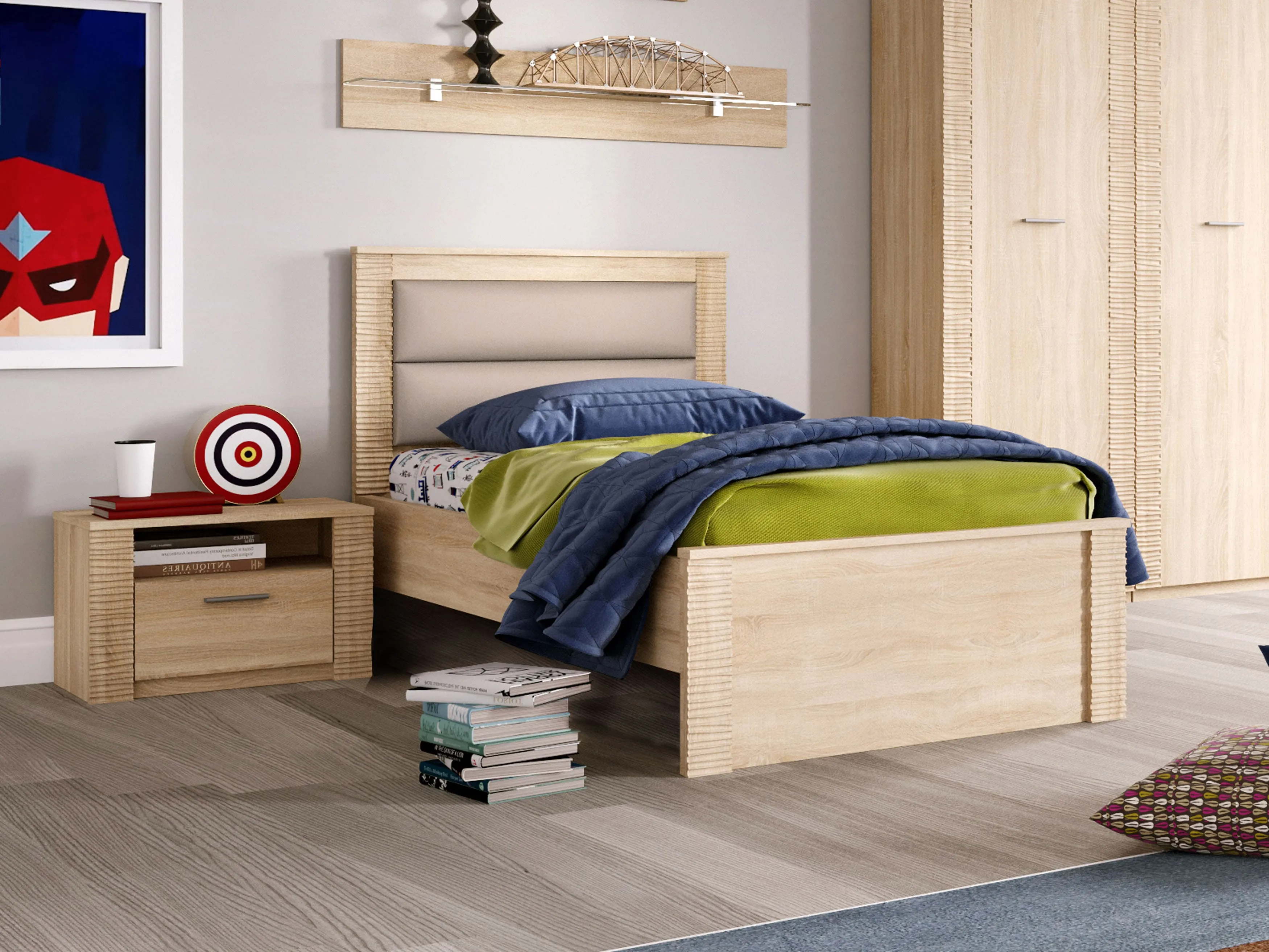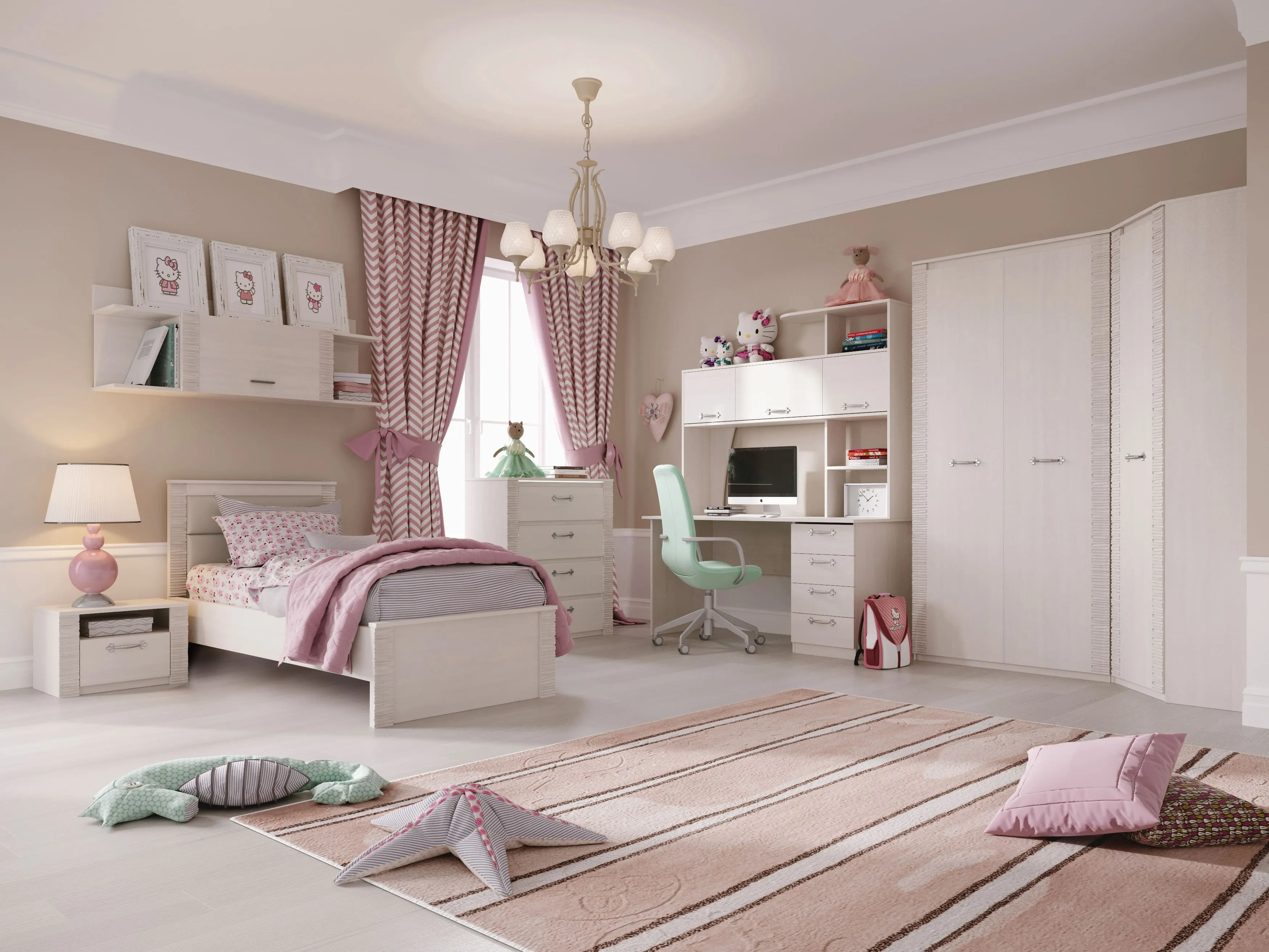 В состав коллекции входят: шкаф однодверный, шкаф угловой, шкаф двухдверный, комод, стол компьютерный, тумба прикроватная, кровать.
