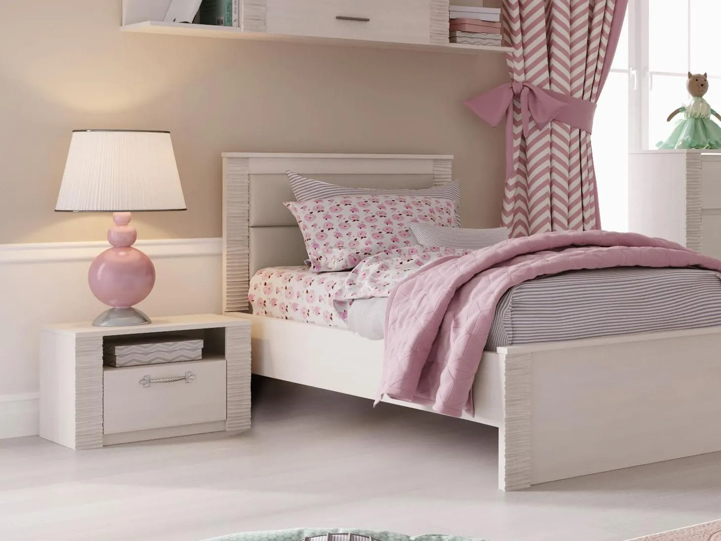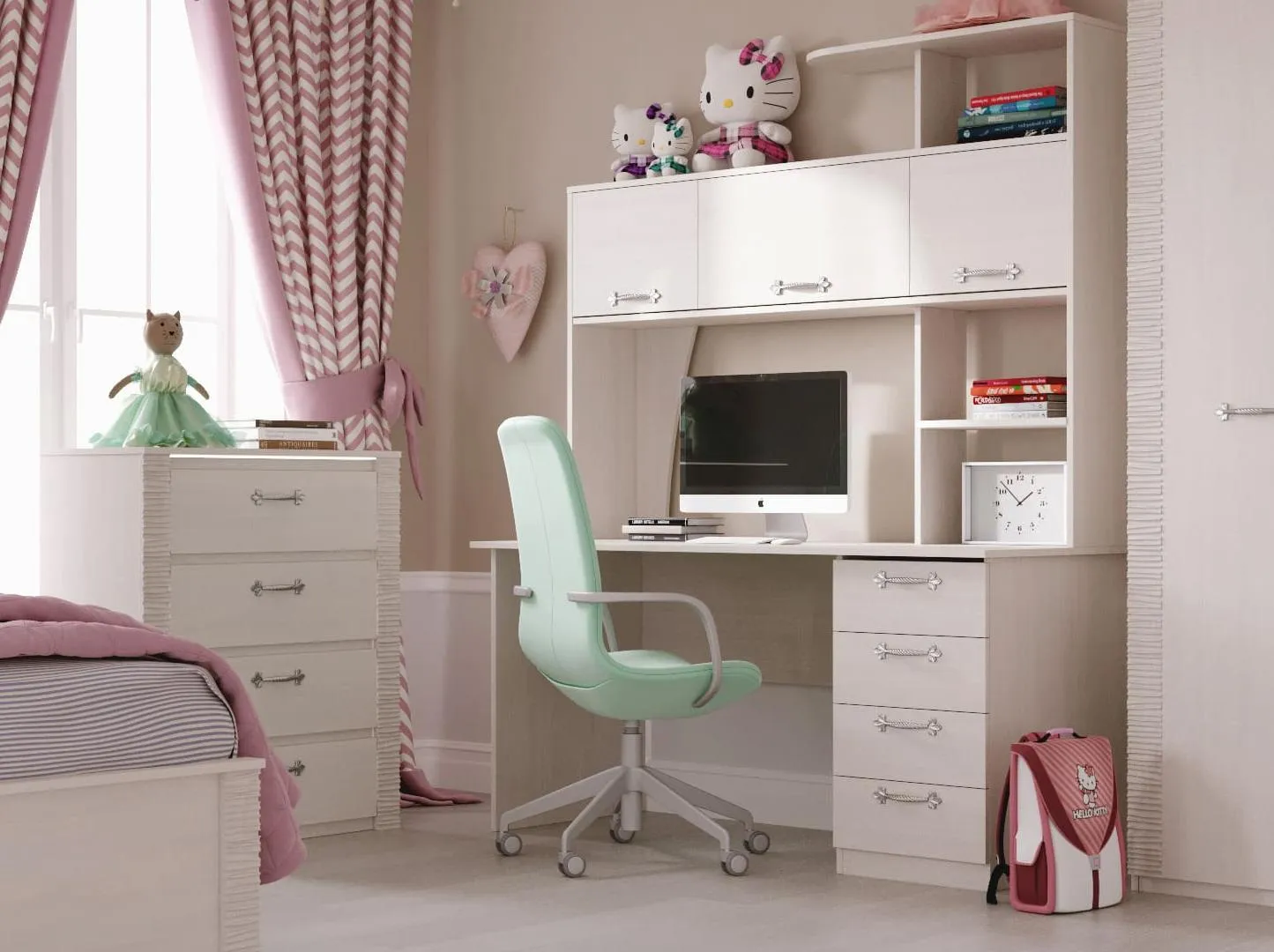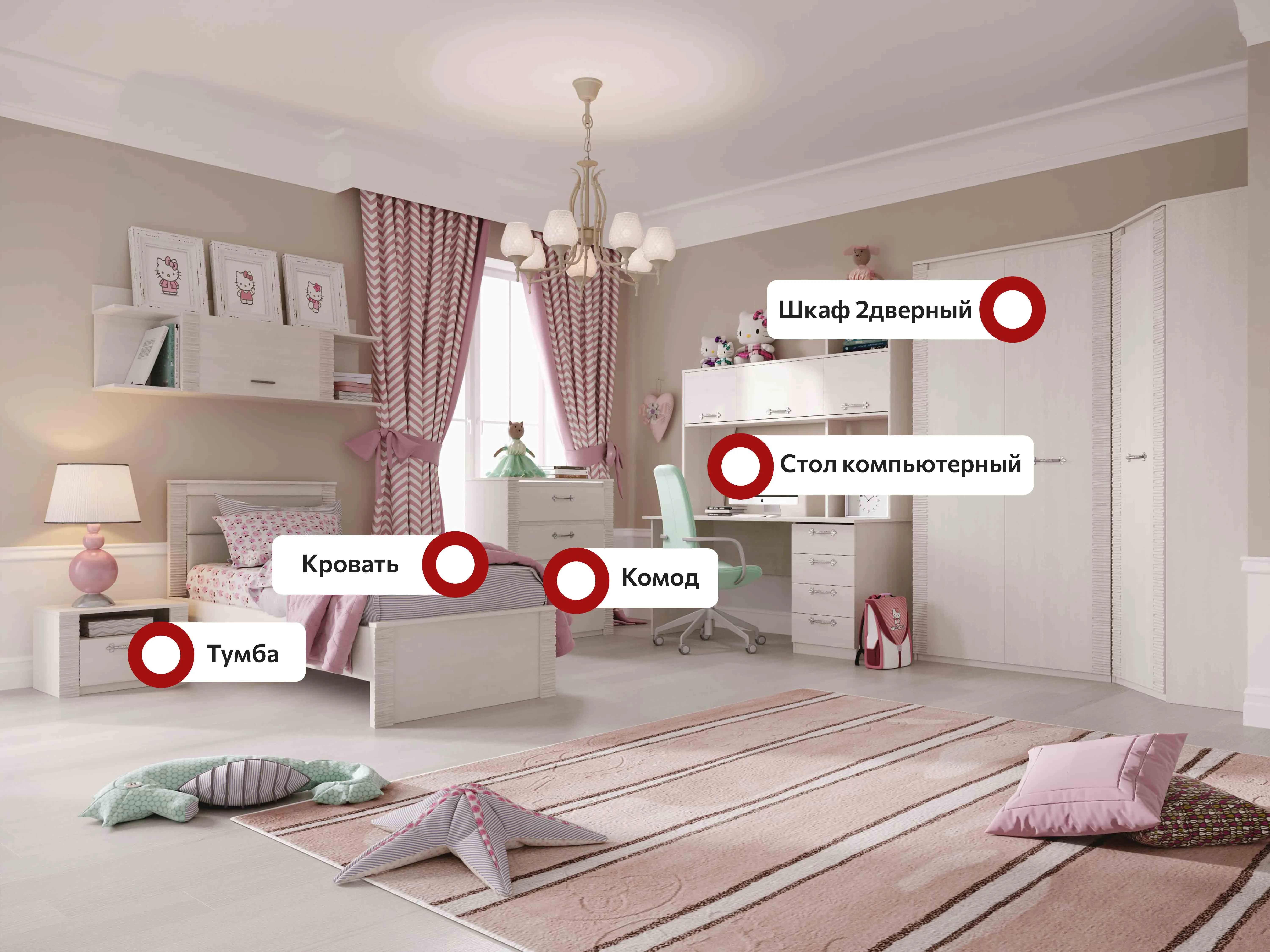 В состав коллекции входят: шкаф однодверный, шкаф угловой, шкаф двухдверный, комод, стол компьютерный, тумба прикроватная, кровать.