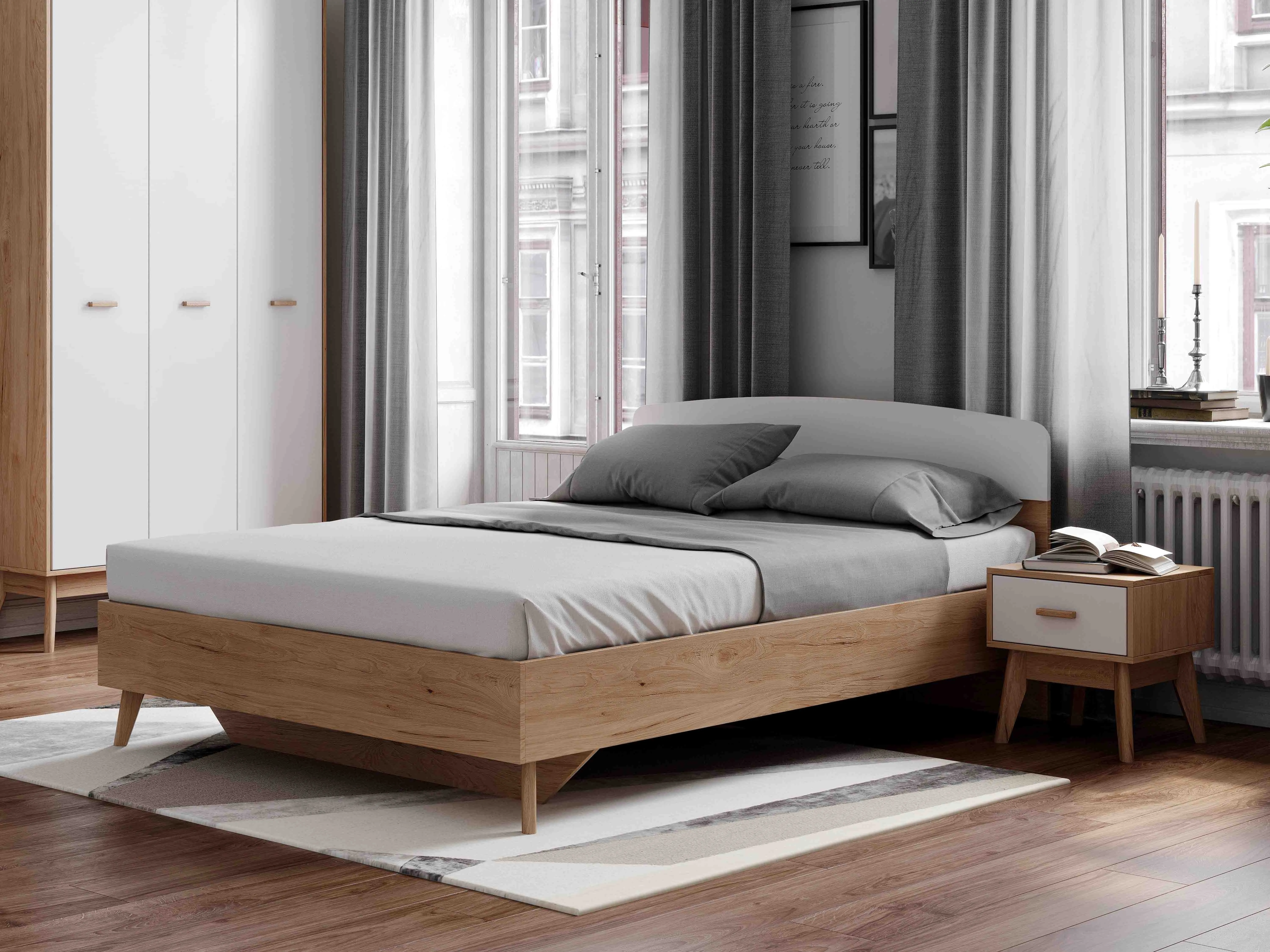 Корпус изготовлен из ЛДСП толщиной 16 мм в цвет натурального дуба, белая накладка в изголовье - из МДФ толщиной 16 мм. Опоры сделаны из натурального массива березы. Высота опор 25 см. Высота спального места 38 см. Рекомендуемая высота матраса 16-25 см. В комплект кровати входит прочное ортопедическое основание на березовых ламелях. Максимальная нагрузка на одно спальное место составляет 150 кг.