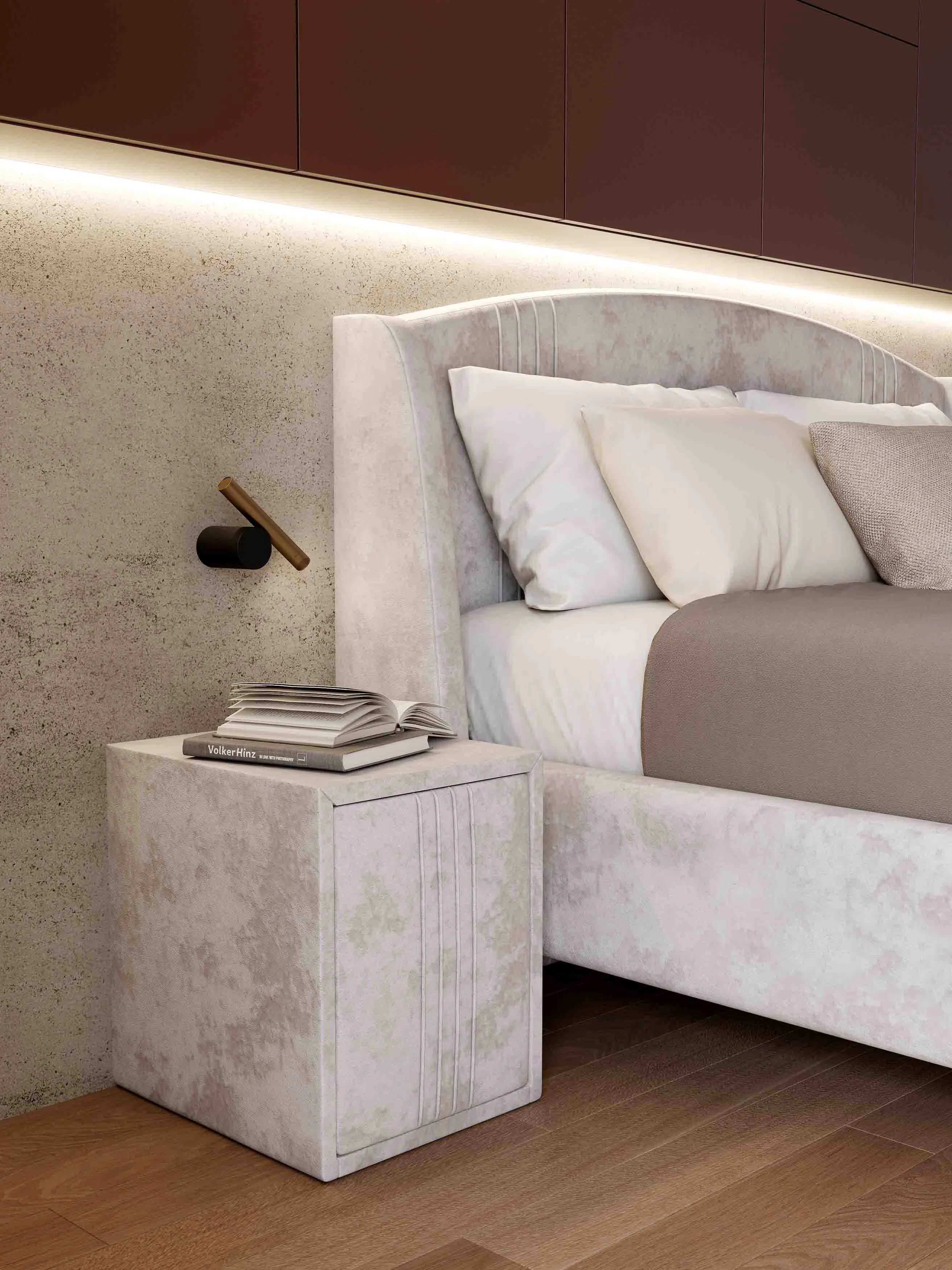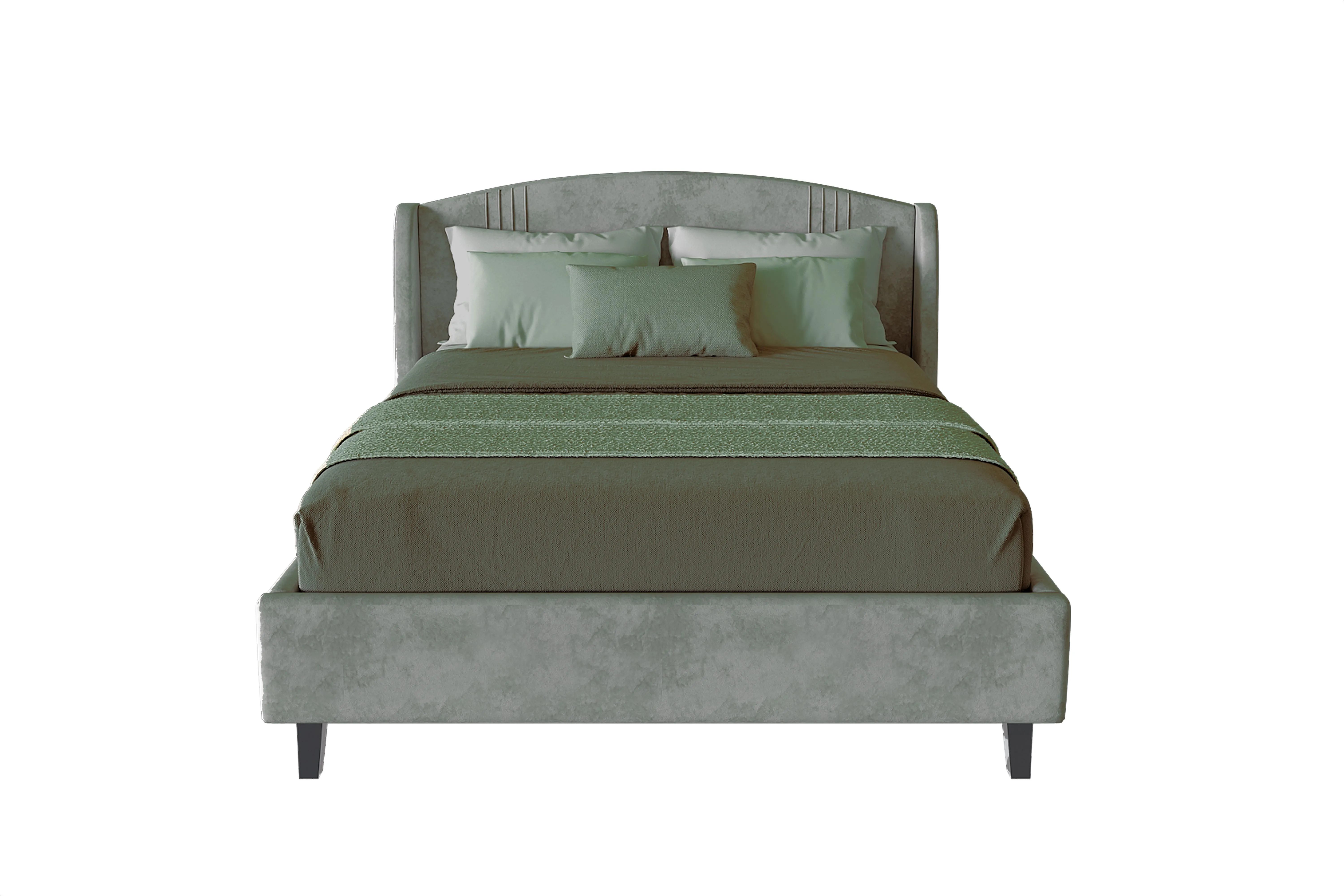 Каркас кровати обит мягким и приятным на ощупь велюром, который хорошо держит форму, устойчив к механическим воздействиям (в том числе к зацепкам от когтей животных), гипоаллергенен.