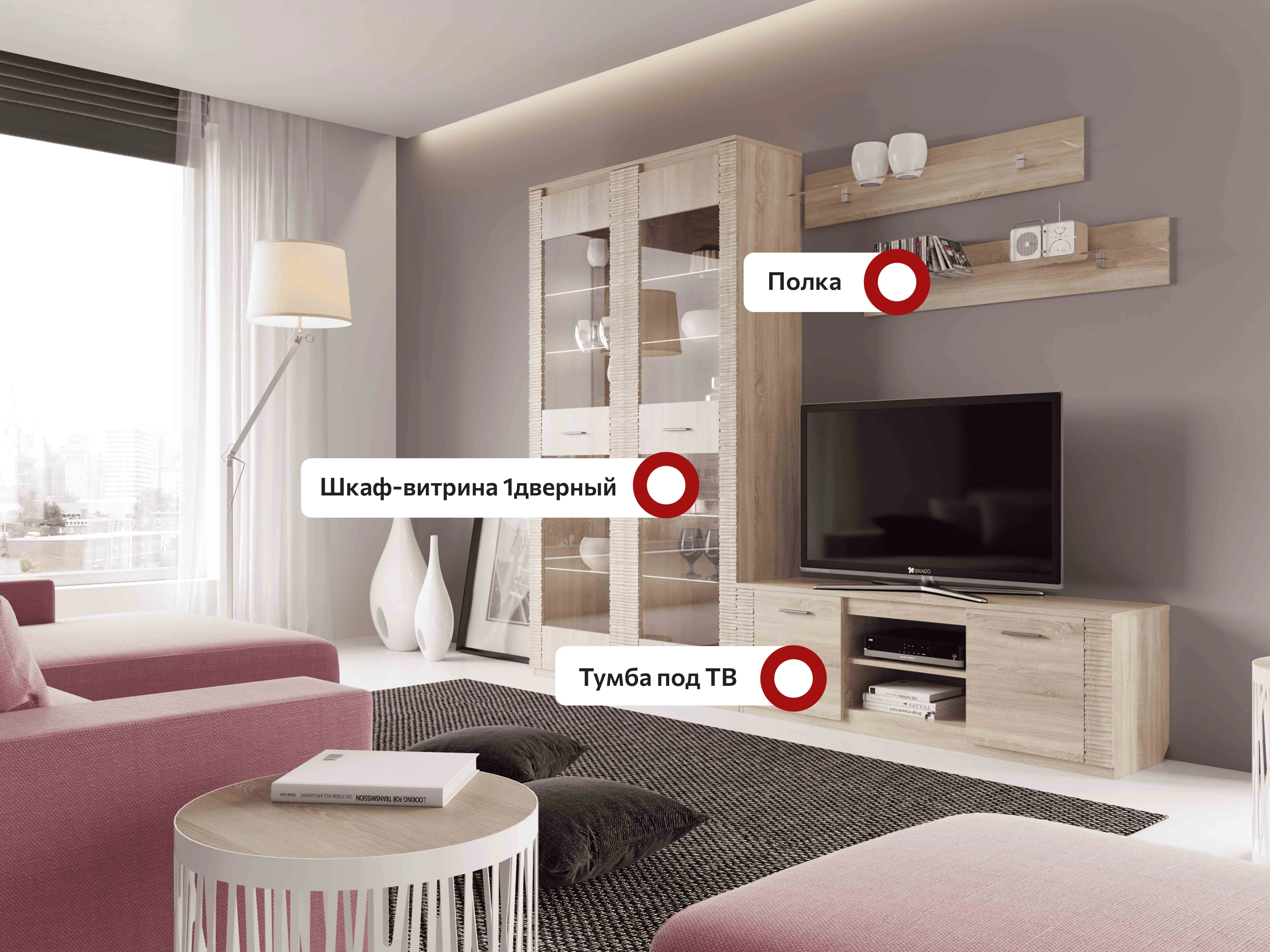 В состав серии входят: витрина, шкаф однодверный, шкаф угловой, шкаф двухдверный, комод с баром, тумба ТВ, полка закрытая, полка.