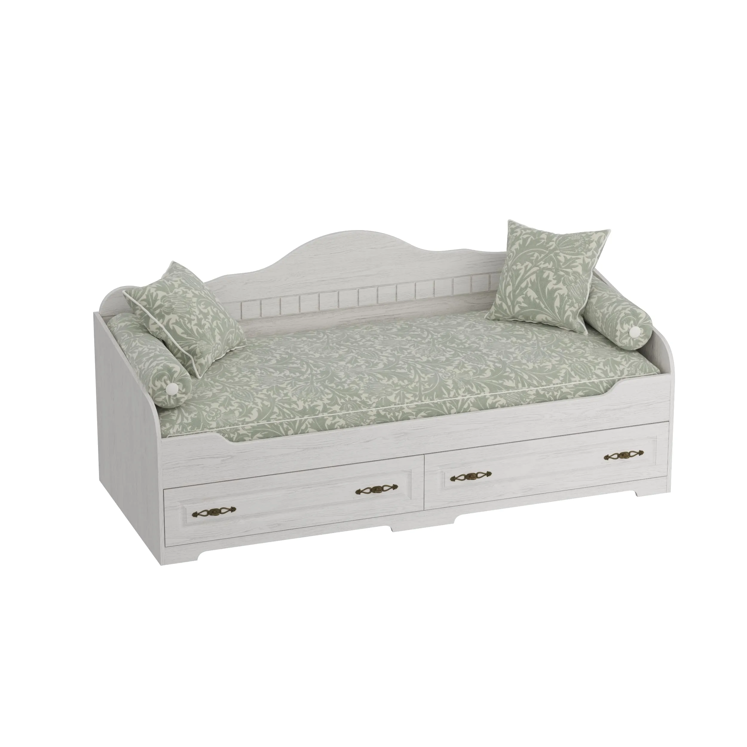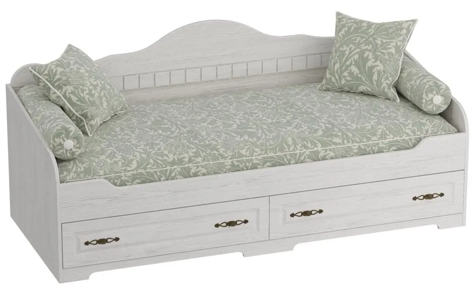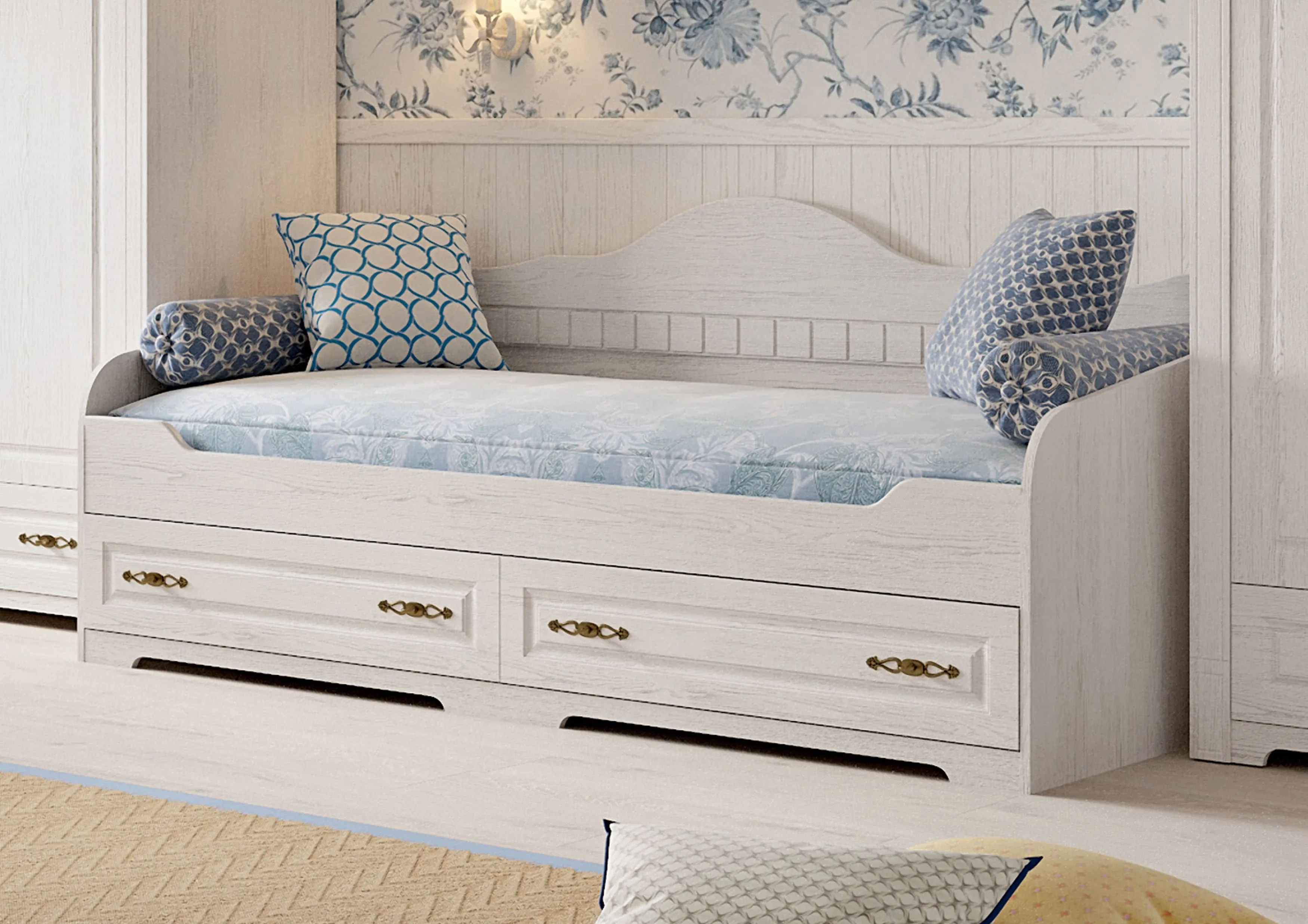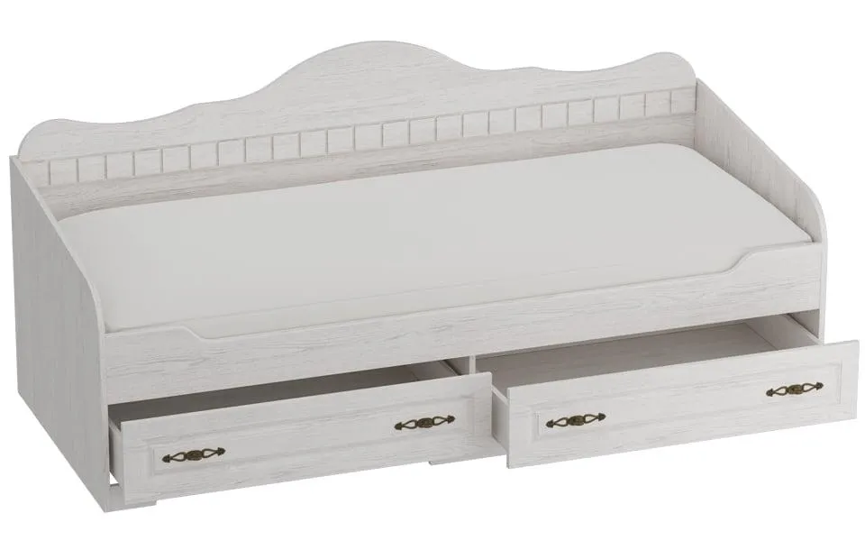 Комфортная детская кровать-софа, фигурная пристенная панель которой украшена минималистским резным декором, оснащена двумя вместительными выдвижными ящиками для белья под основанием. Матрасное основание и выдвижные ящики входят в комплектацию кровати. Матрас приобретается дополнительно.