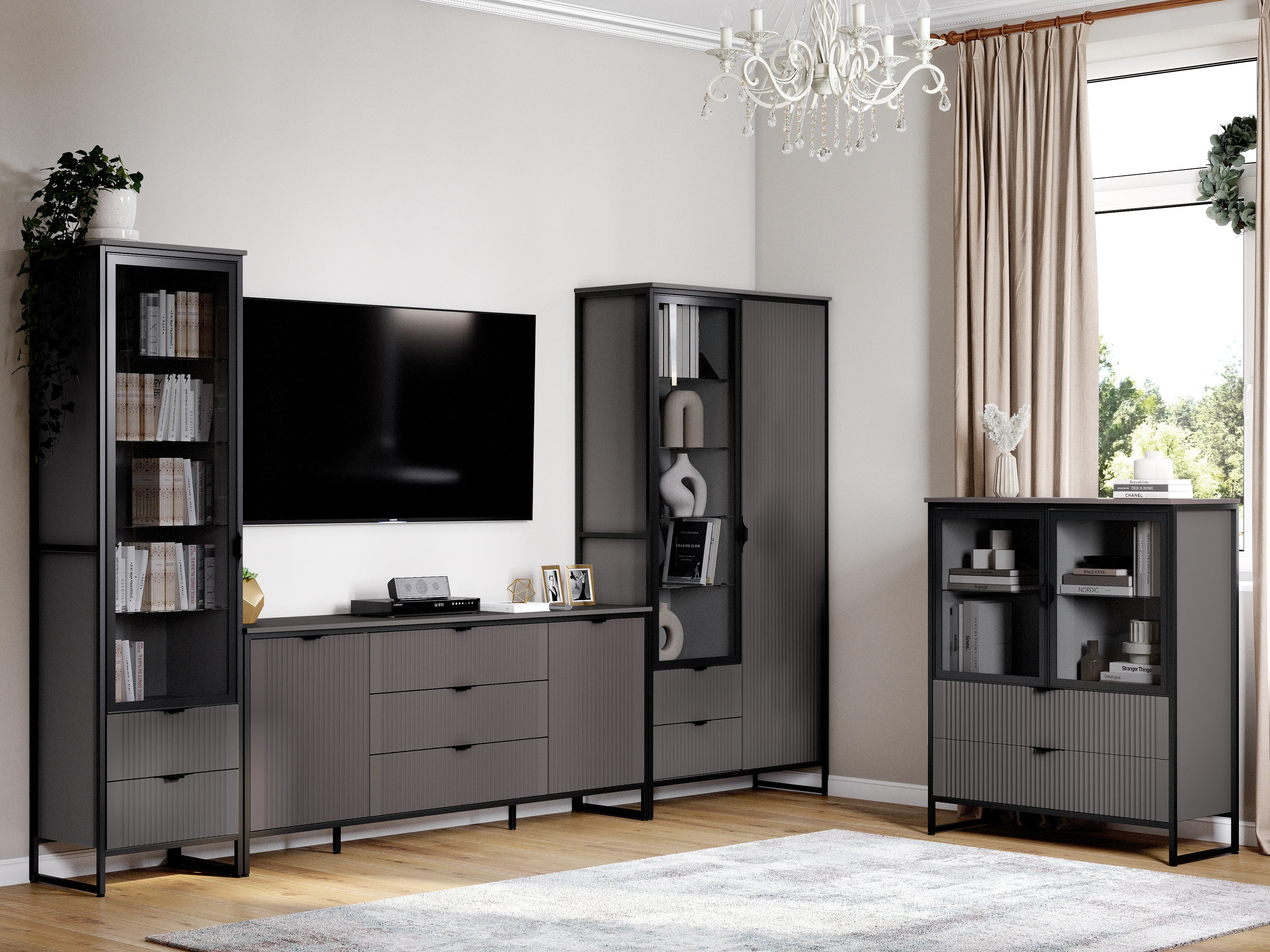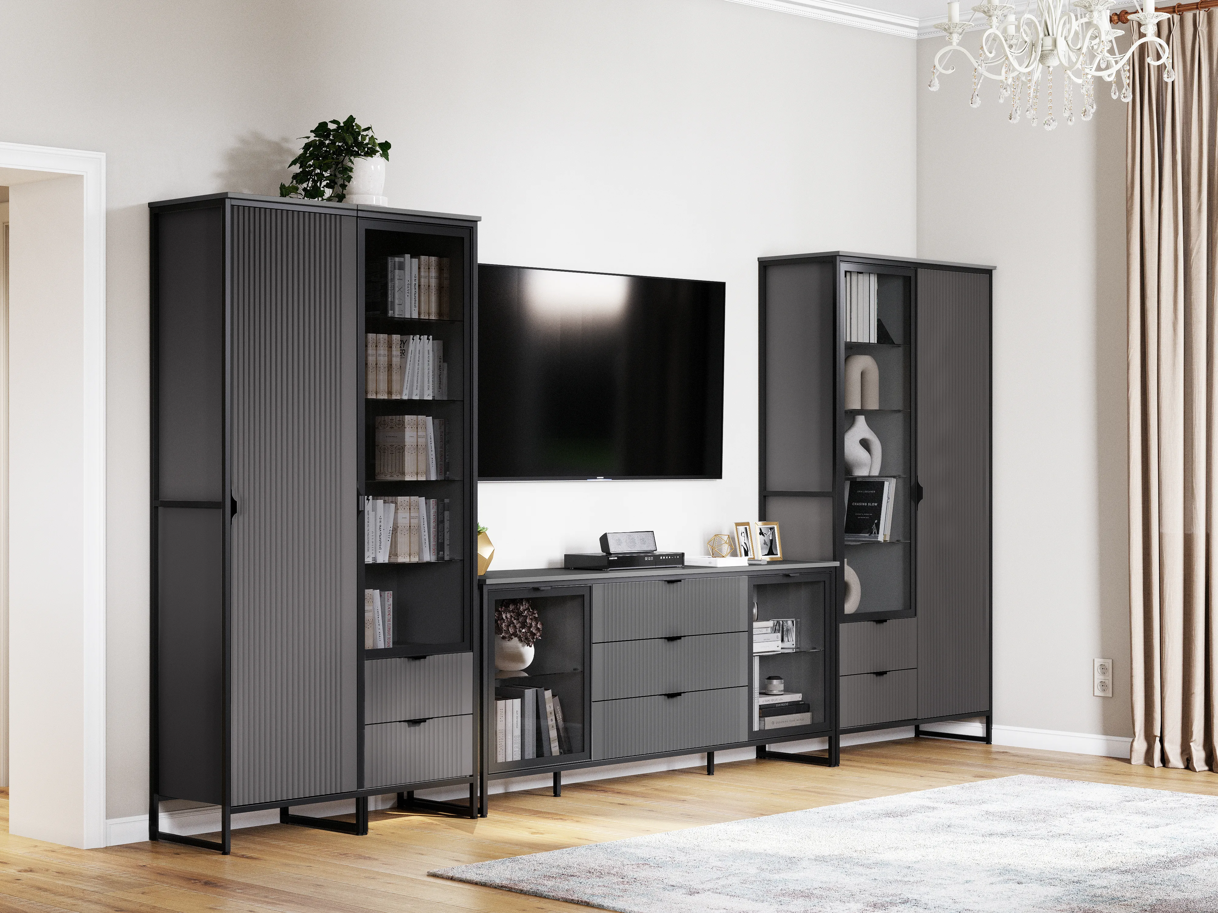 Коллекцию модульной гостиной "Нора" отличает современный оригинальный стиль. Декоративная продольная фрезеровка на фазадах из МДФ и опоры на металлокаркасе цвета соответствуют модным тенденциям этого года в ведущих зарубежных коллекциях.