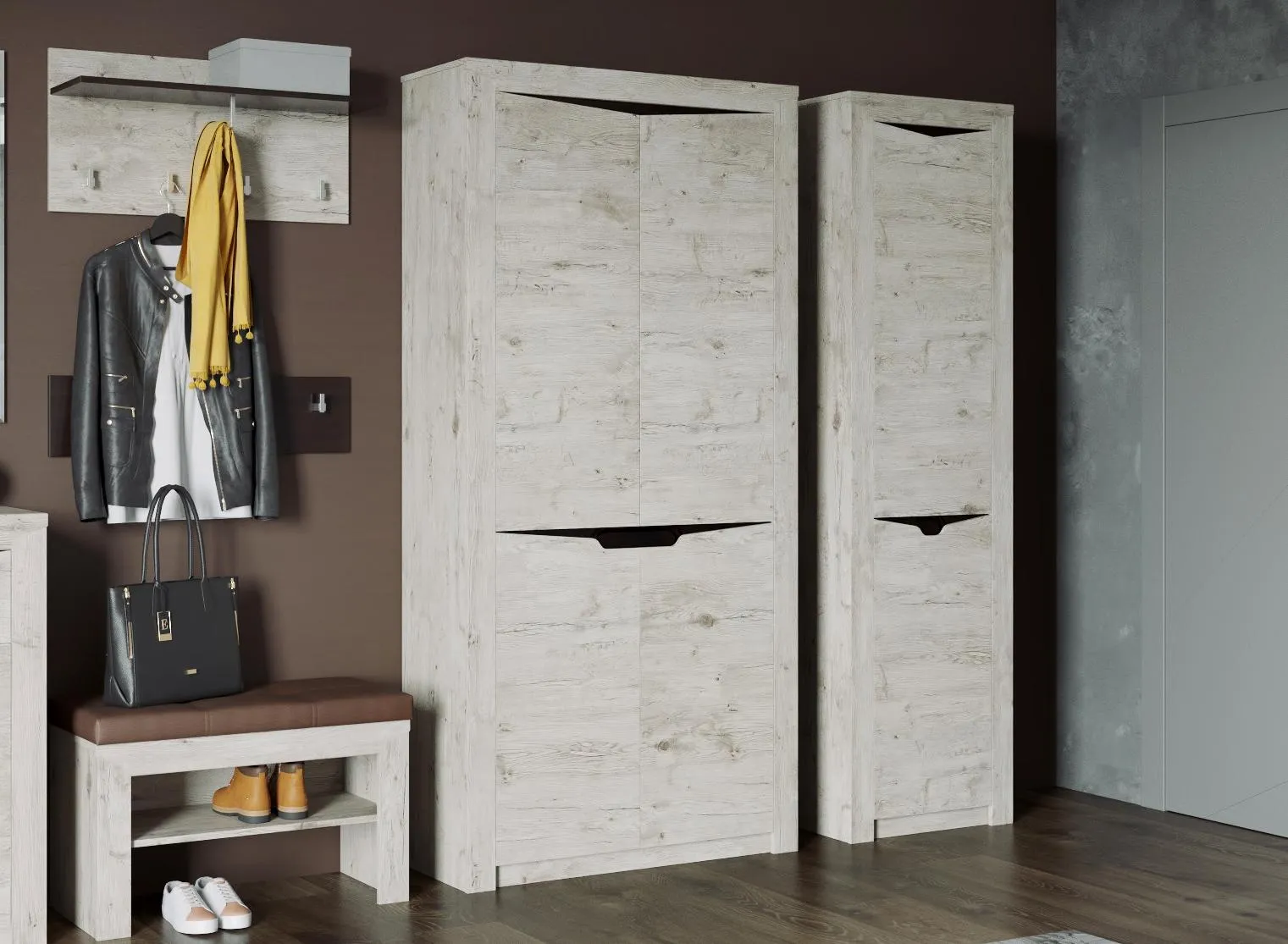 Двухдверный шкаф "Соренто" - это отличный выбор для тех, кто хочет сохранить порядок в своём доме. Шкаф имеет современный дизайн и выполнен из качественных, безопасных материалов. На фасаде имеются декоративные вырезы, выполняющие функцию ручек.