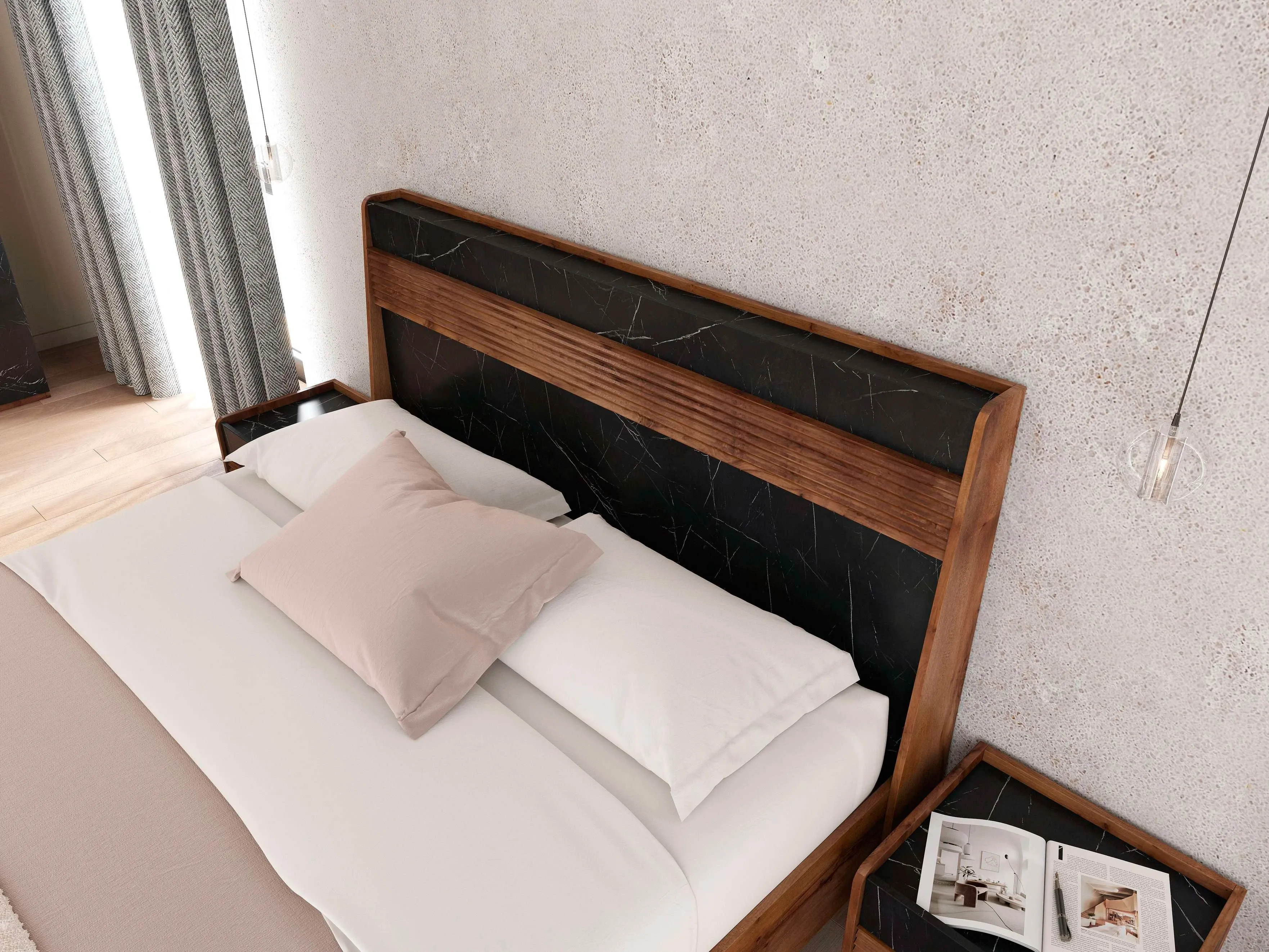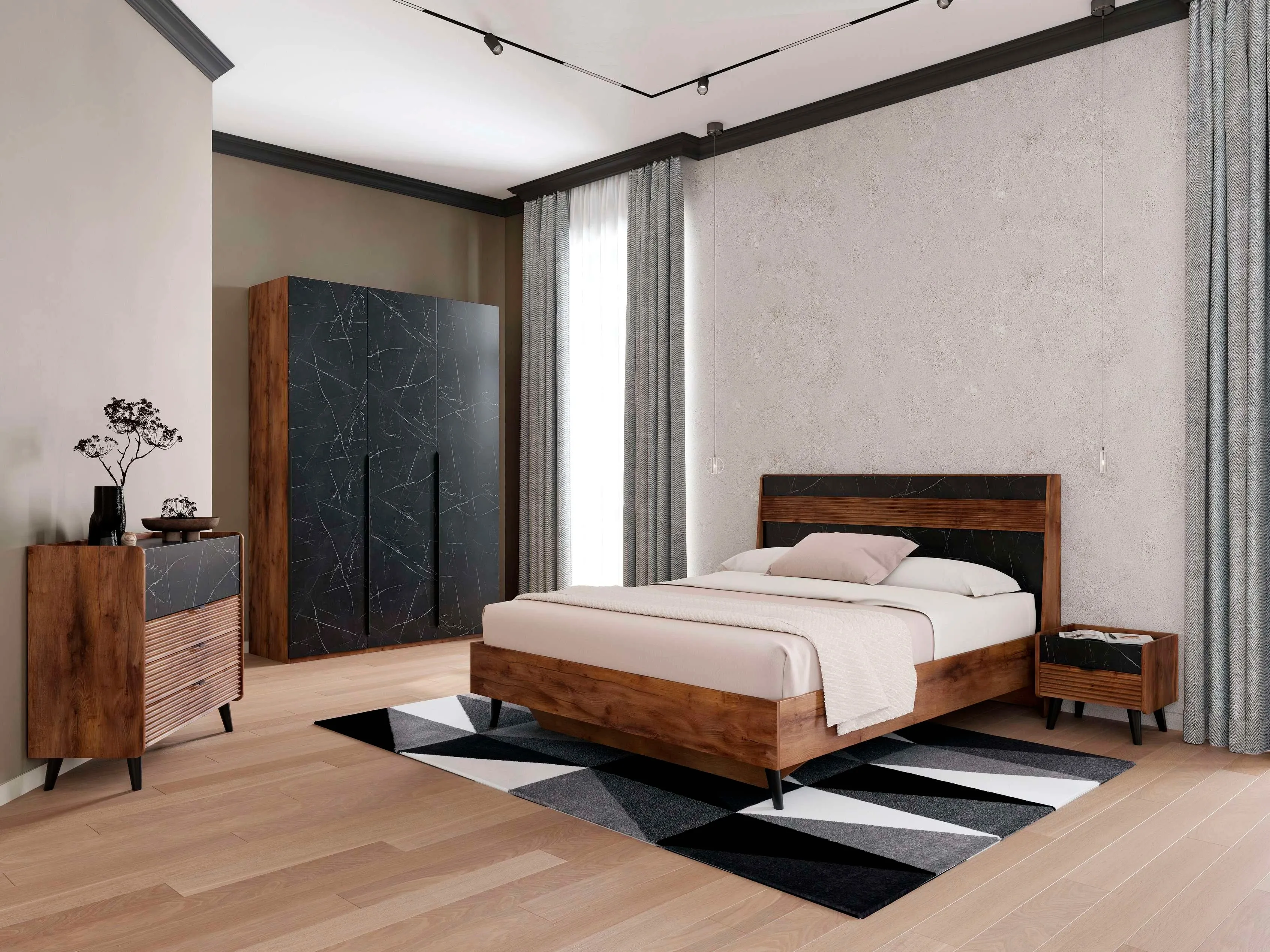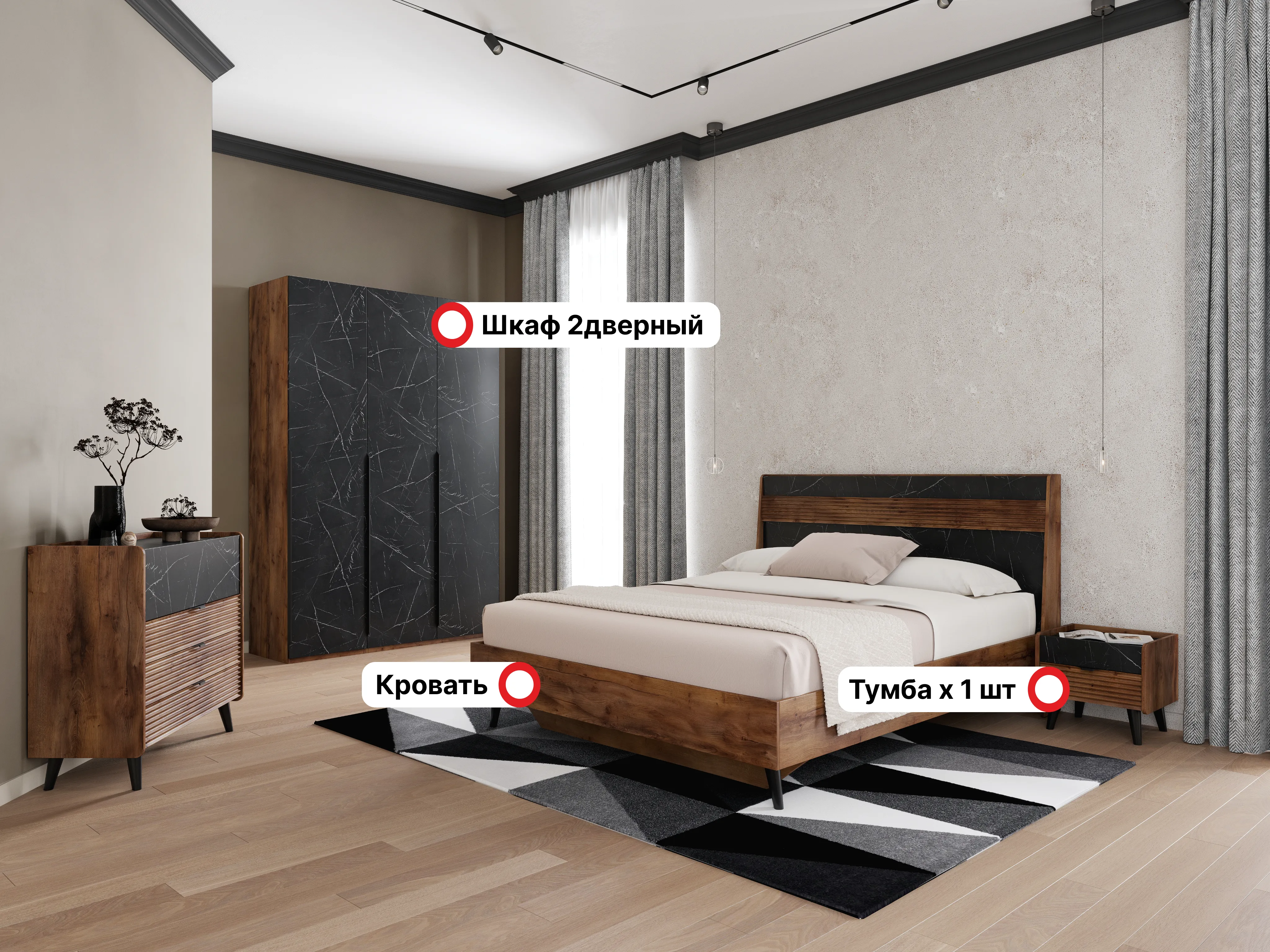 Гарнитур подходит как для просторных, так и для небольших спален, помогая эффективно использовать пространство и создавать уютное и светлое место для отдыха и сна.