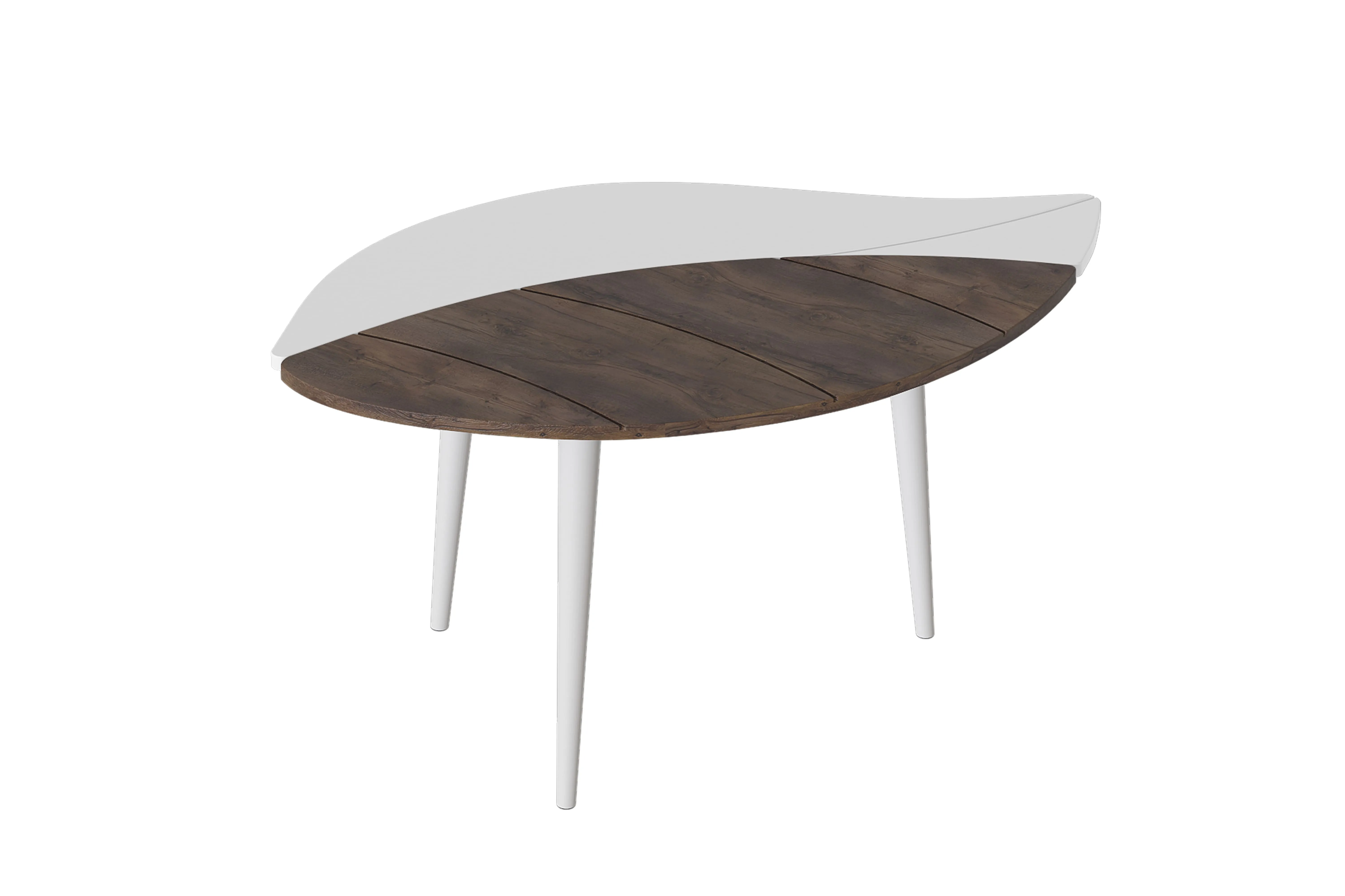 Особенностью дизайнерского решения журнального стола №17 является оригинальное сочетание фигурных элементов столешницы в форме листа дерева. Опоры выполнены из дерева.