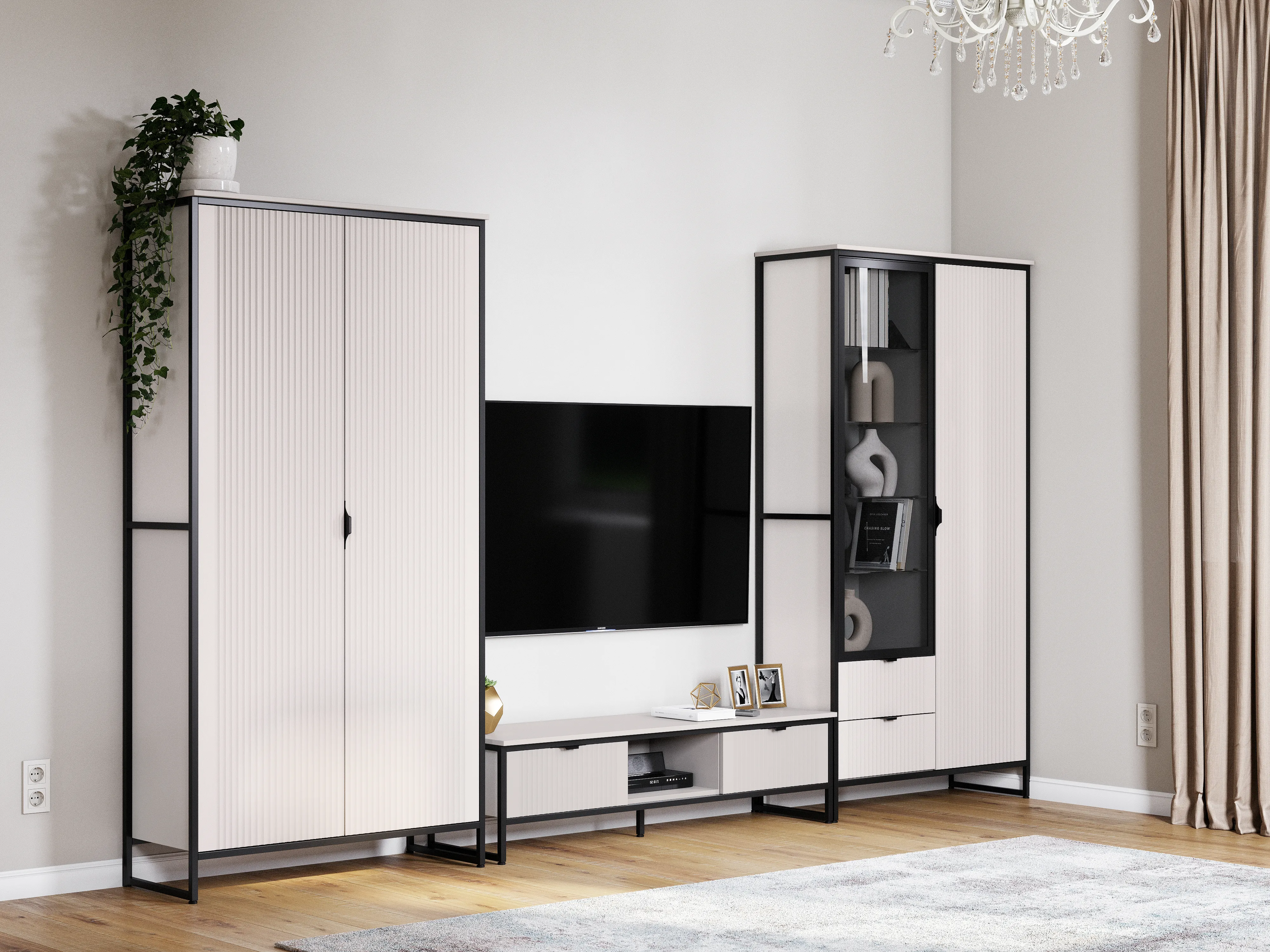Коллекцию модульной гостиной "Нора" отличает современный оригинальный стиль. Декоративная продольная фрезеровка на фазадах из МДФ и опоры на металлокаркасе цвета соответствуют модным тенденциям этого года в ведущих зарубежных коллекциях.