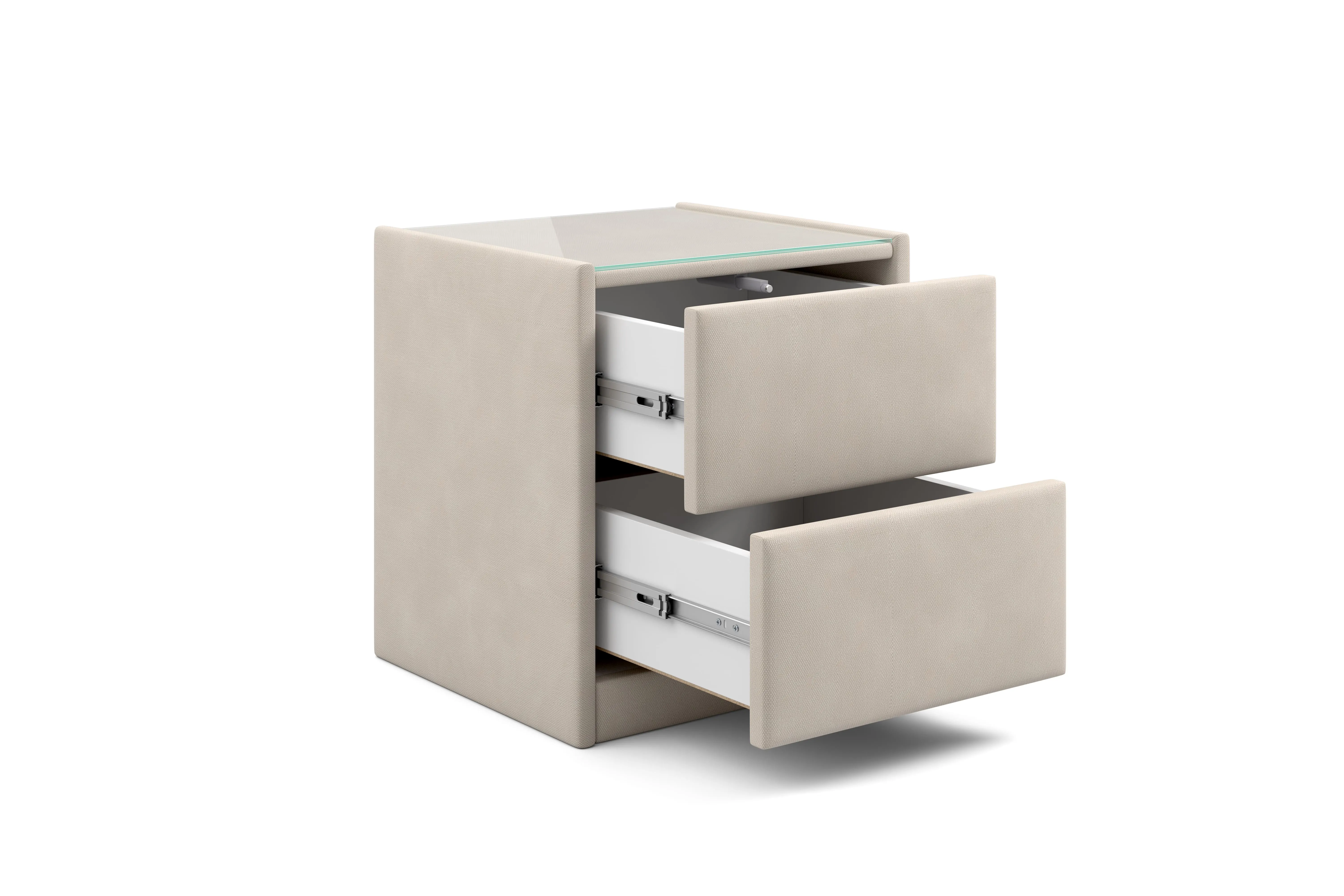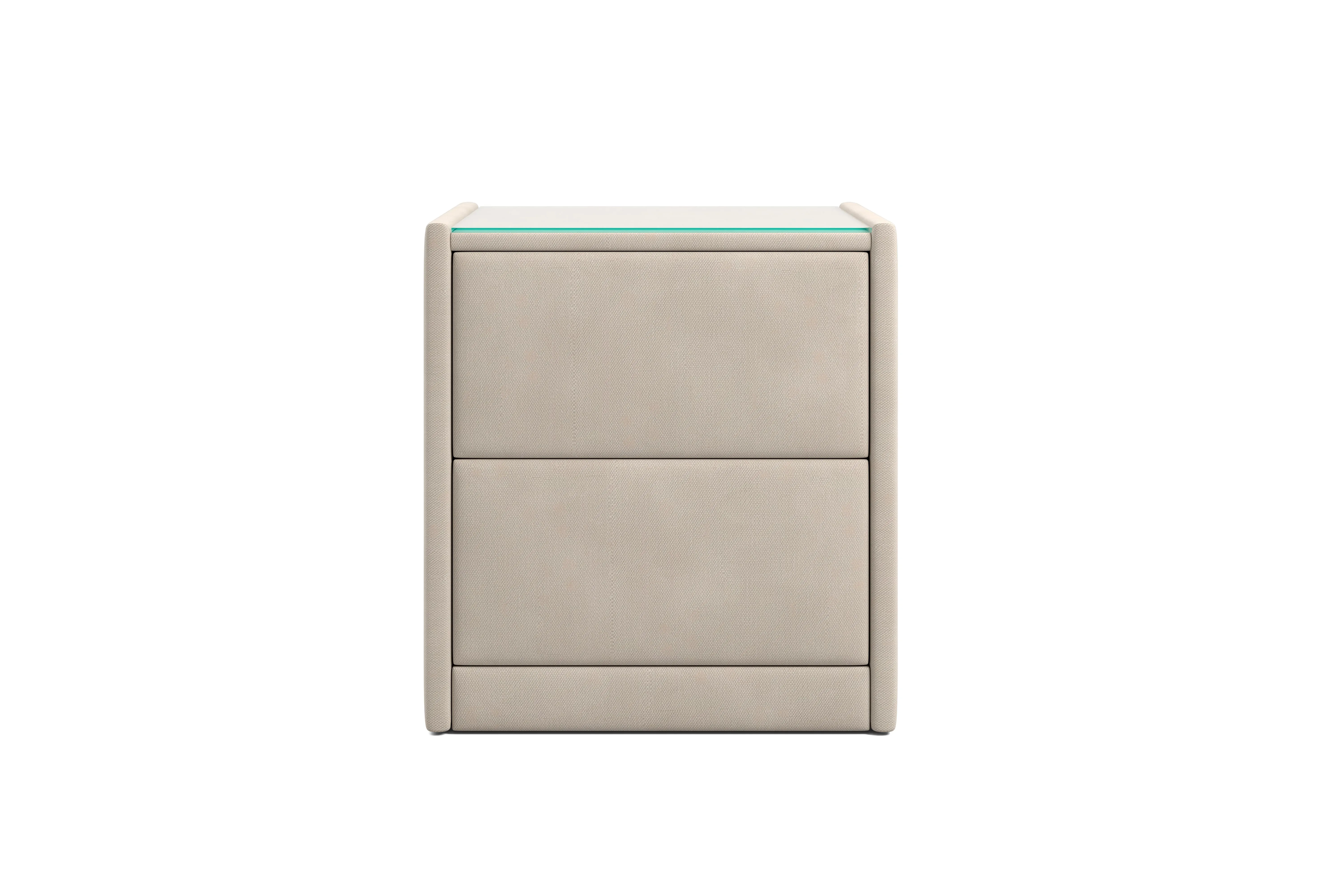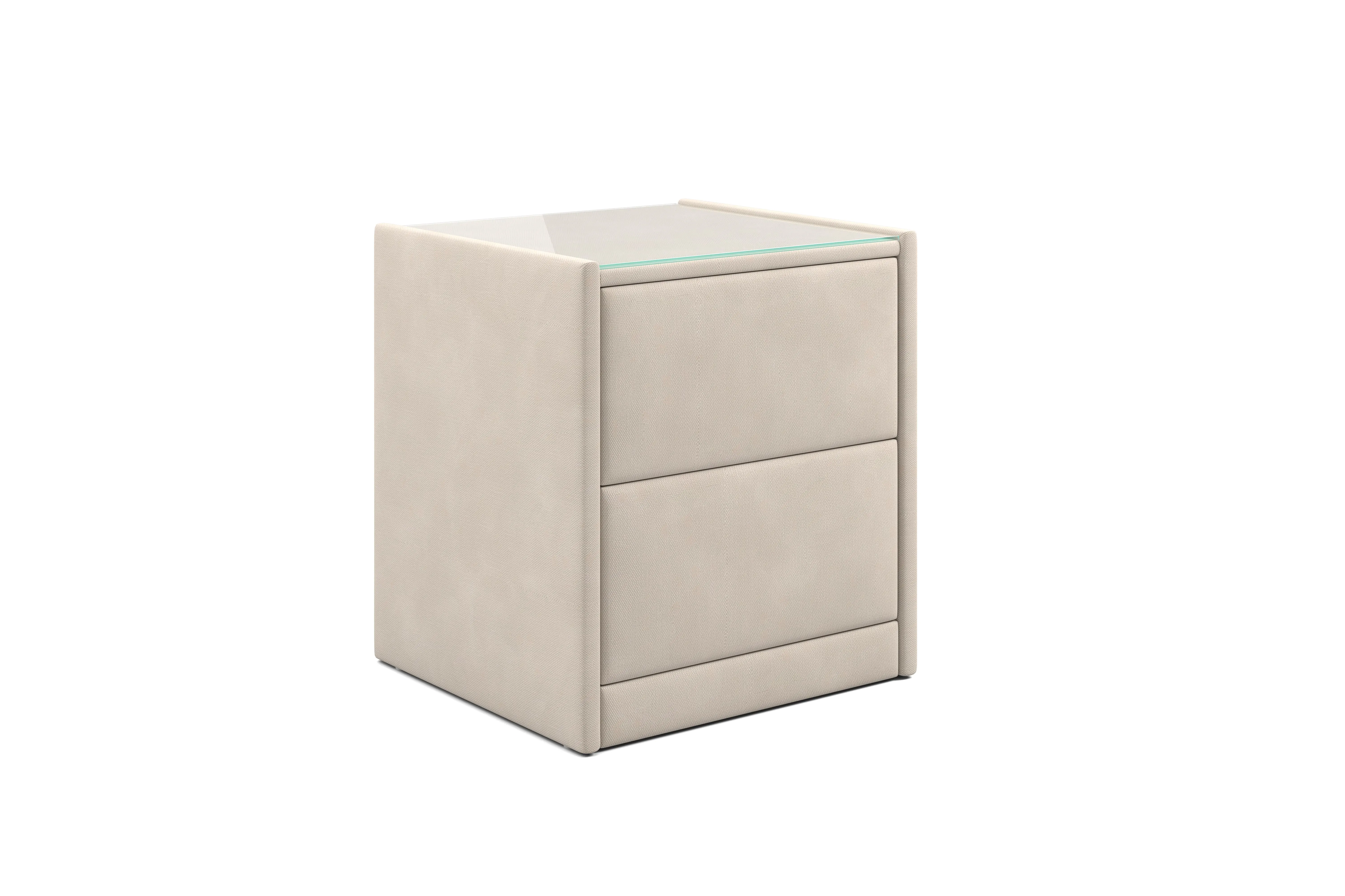 Тумба обтянута высококачественным велюром, что придает ей особый уют и комфорт. Имеет стеклянную столешницу и два вместительных выдвижных ящика с механизмом Push to open. Скругленные торцы модели, минимизируют риск удариться в темноте.