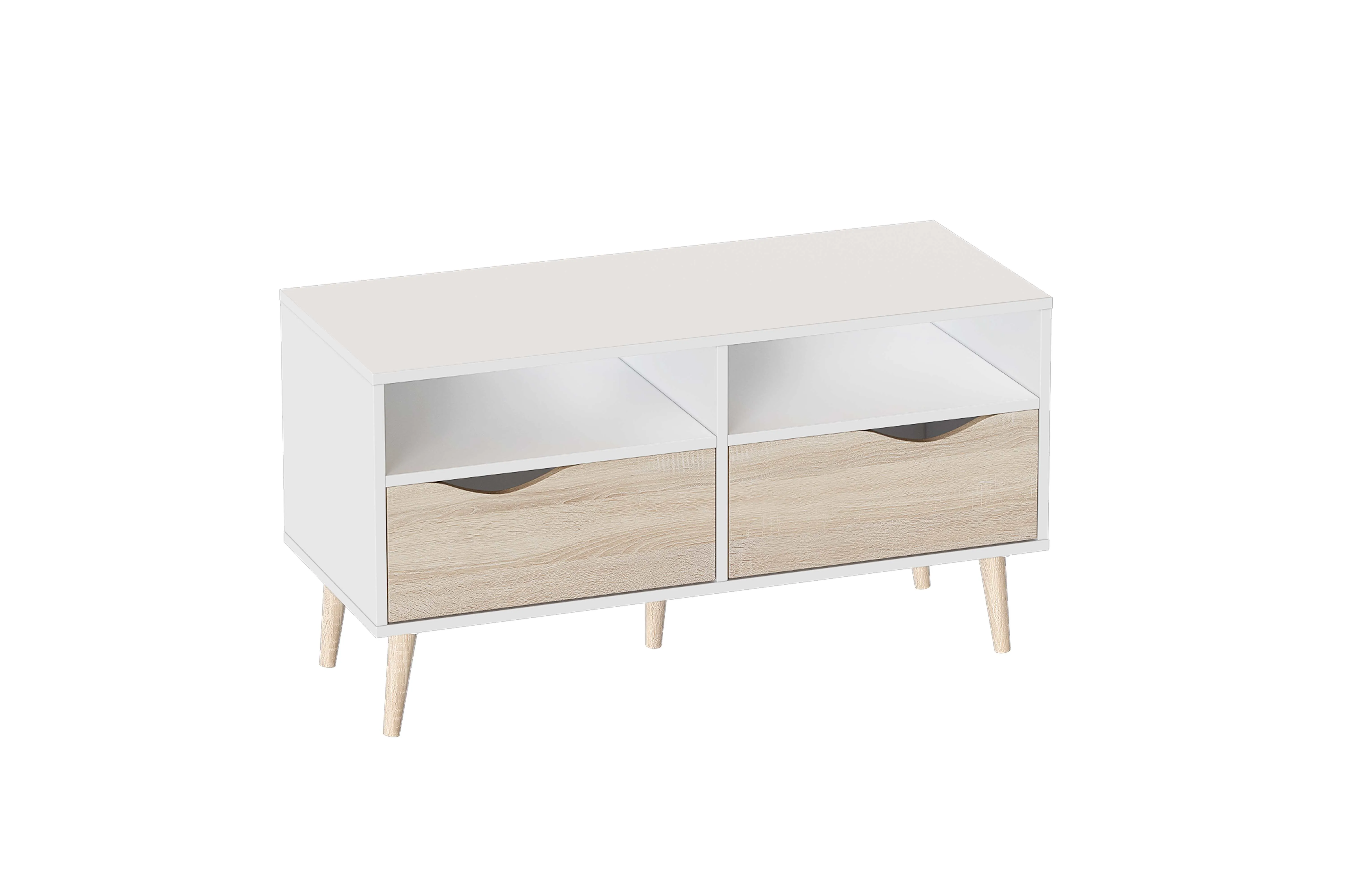Тумба под ТВ малая "Соната" сформирует композиционный центр ТВ-зоны и позволит сохранить больше свободного пространства в гостиной. На поверхности модуля можно расположить телевизор с диагональю до 55-60 дюймов. Упорядочить хранение сопутствующих аксессуаров и компонентов домашнего кинотеатра помогут выдвижные ящики с фасадами, декорированными вырезными ручками в цвете «Дуб Сонома», и открытые ниши.