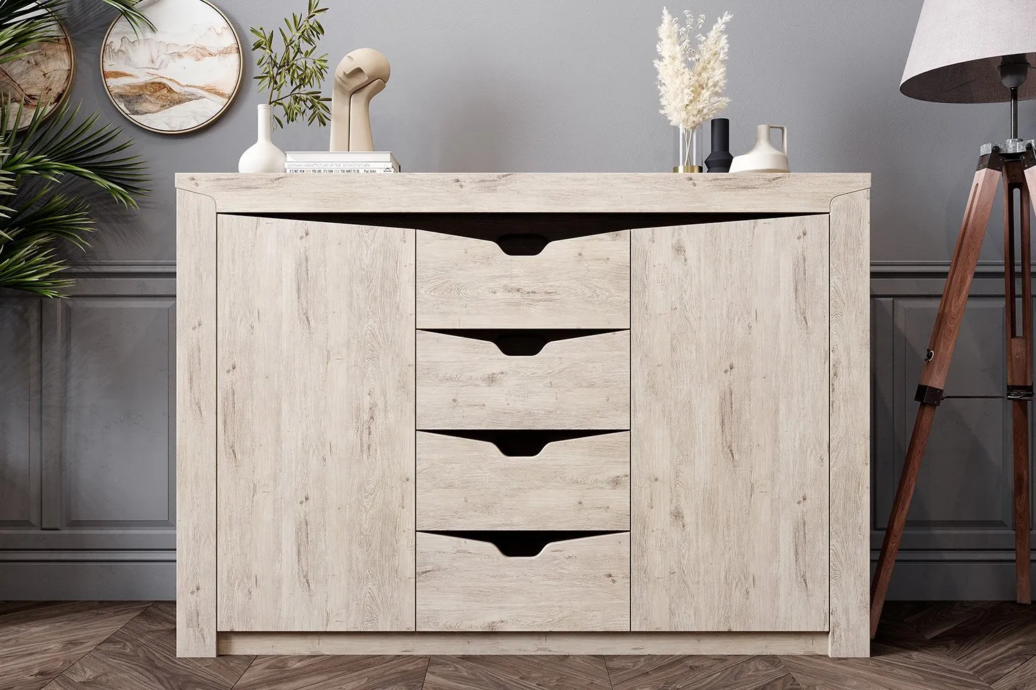 Тумба "Соренто" имеет четыре выдвижных ящика, а также два вместительных отделения по бокам с полками и распашными дверями. На фасаде имеются декоративные вырезы, выполняющие функцию ручек.