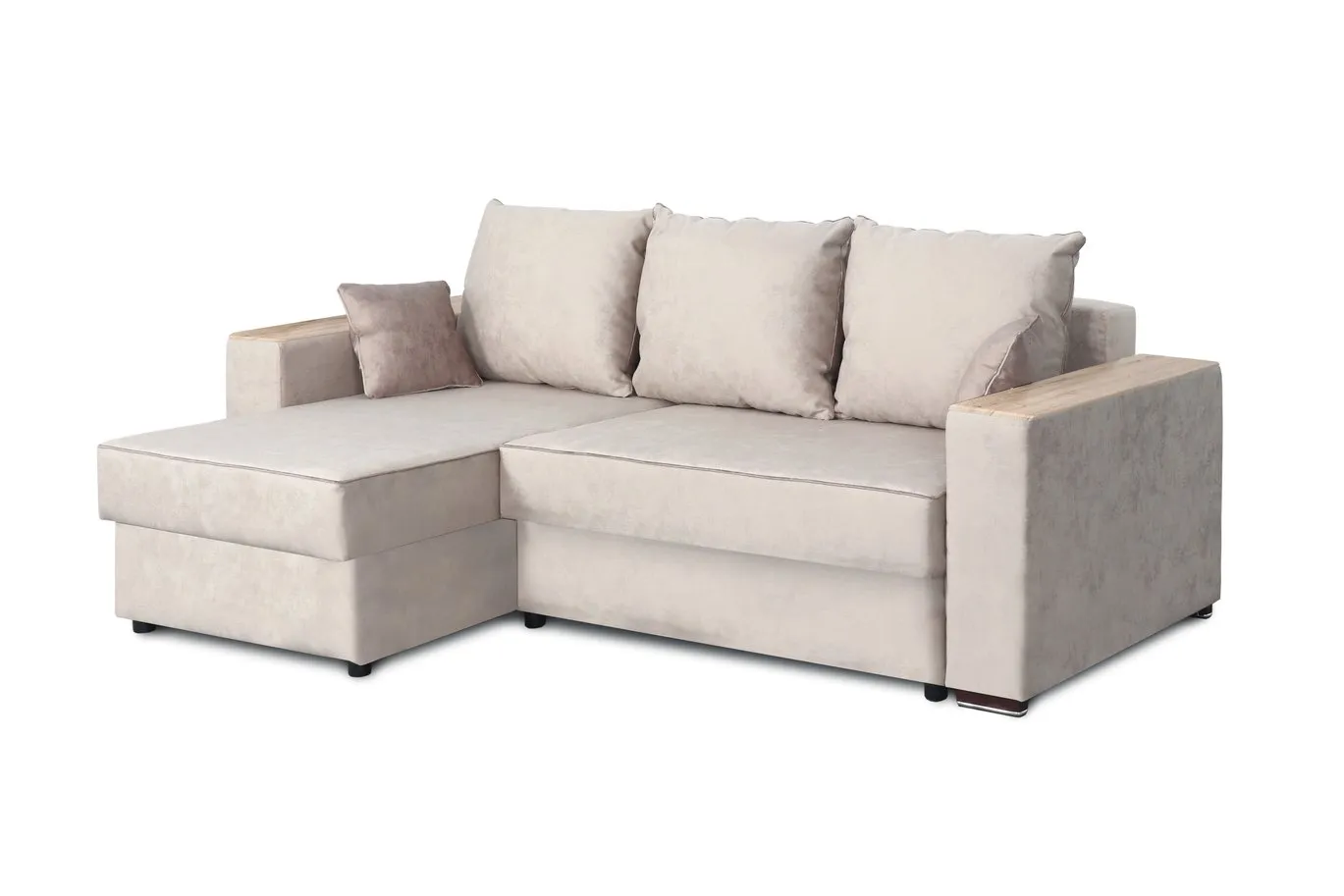 С одной стороны расположена боковина с нишей, с другой – ящики. Надежные петли с доводчиками добавляют комфортности использования мебели. Диван-трансформер может быть прямым, угловым и П-образным. Малые декоративные подушки входят в комплект дивана.